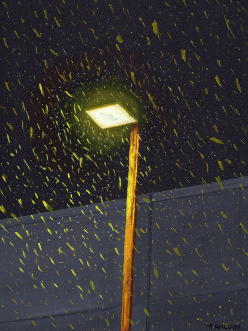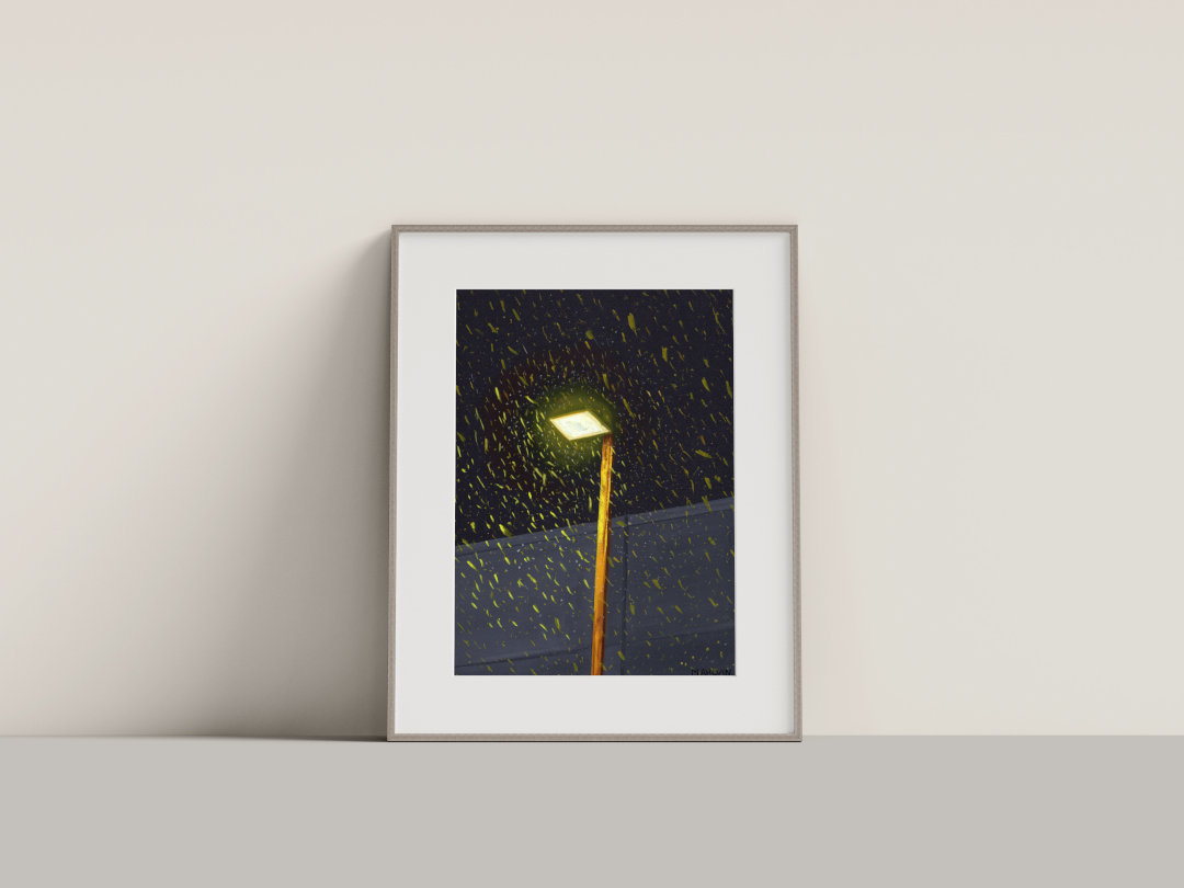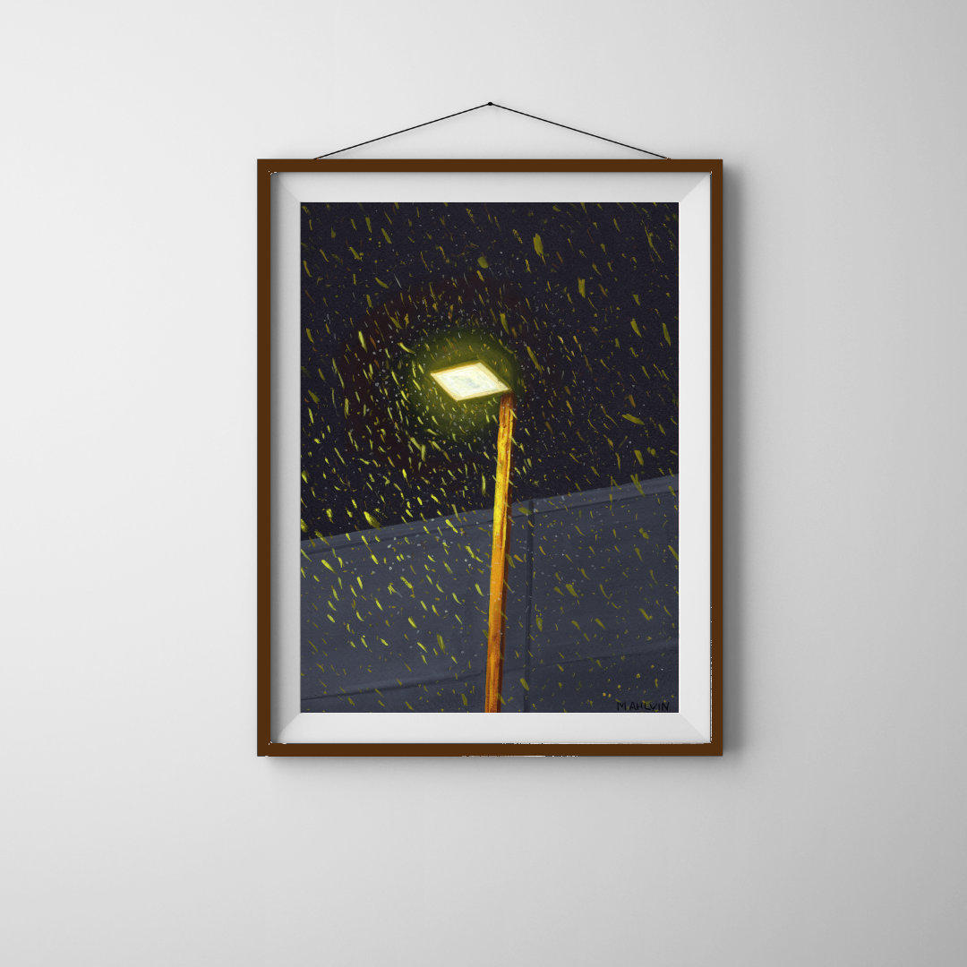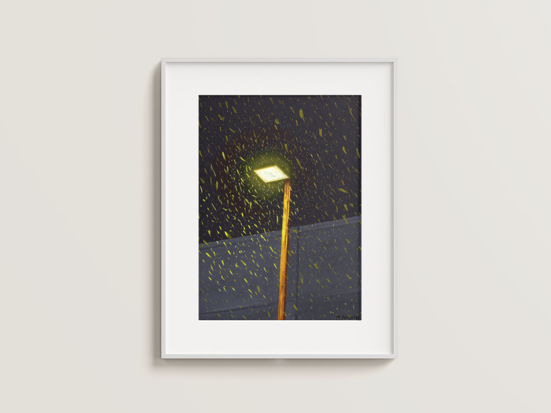 An original gouache painting featuring the first snowfall of the season.