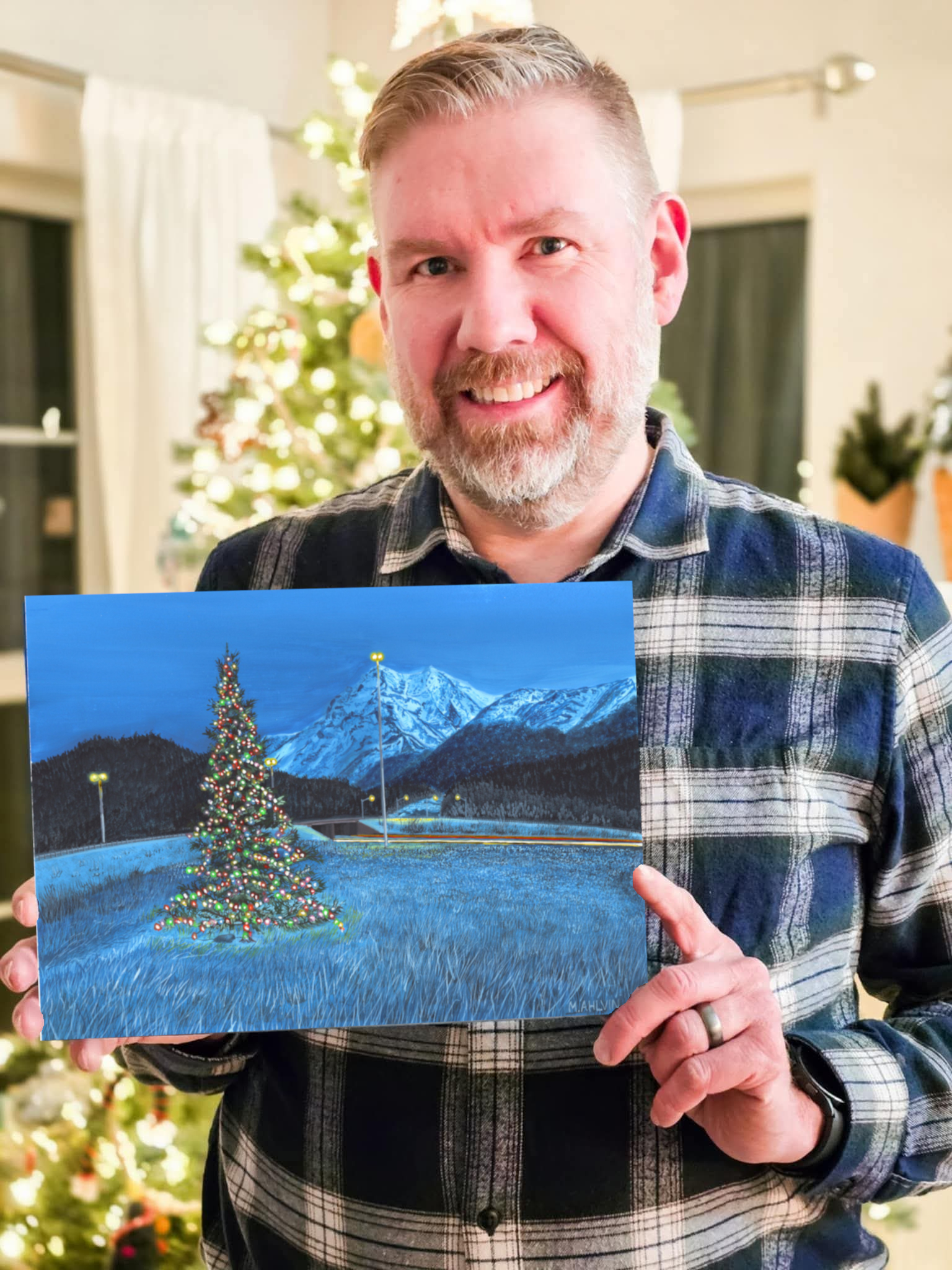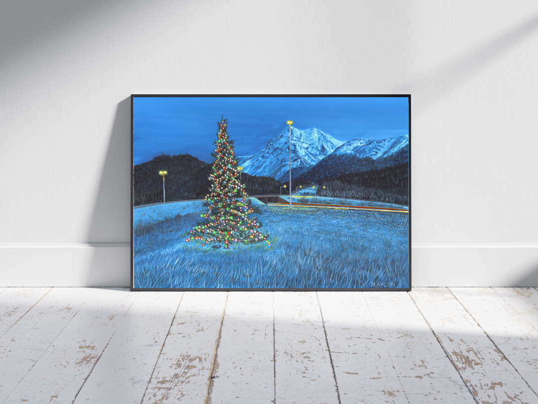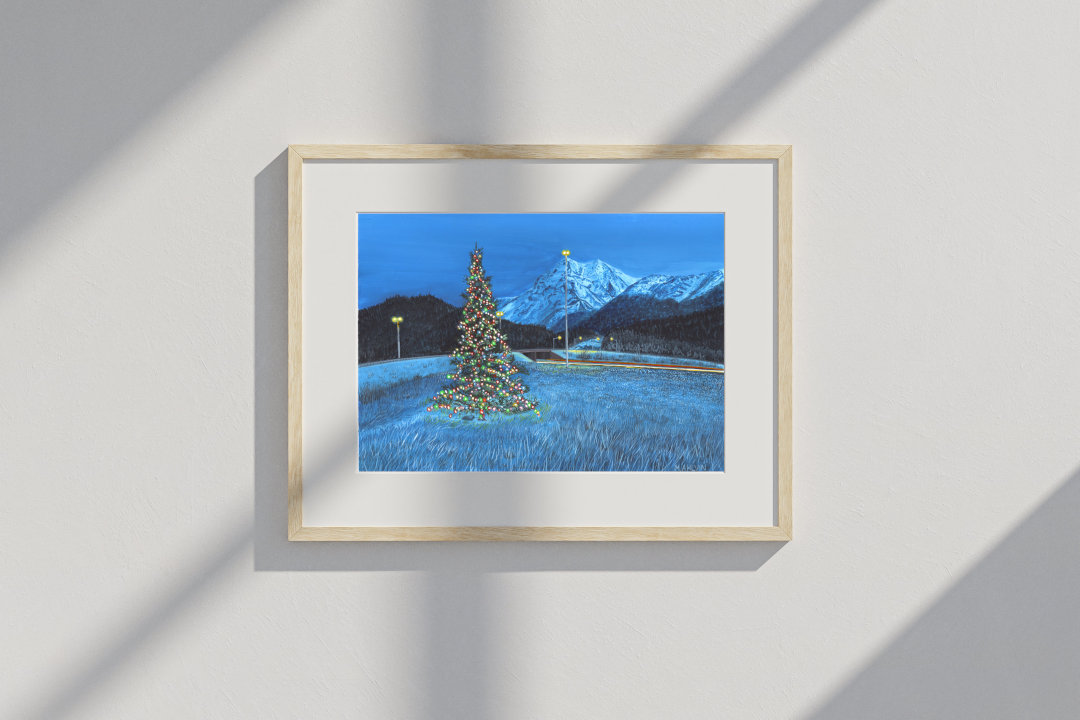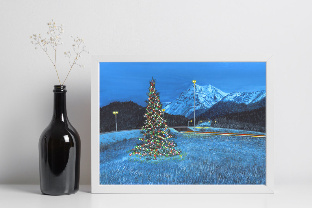 This painting is based on the Glenn Highway Christmas Tree, another annual Christmas tradition. Near the Old Glenn Highway exit, just before the Knik River bridge,  a tree is decorated with Christmas lights every year and then lit on Thanksgiving. A tradition dating back over two decades, it’s a gesture that brings a bit of holiday cheer to all those thousands that commute between the Valley and Anchorage during the darkest months of the year.