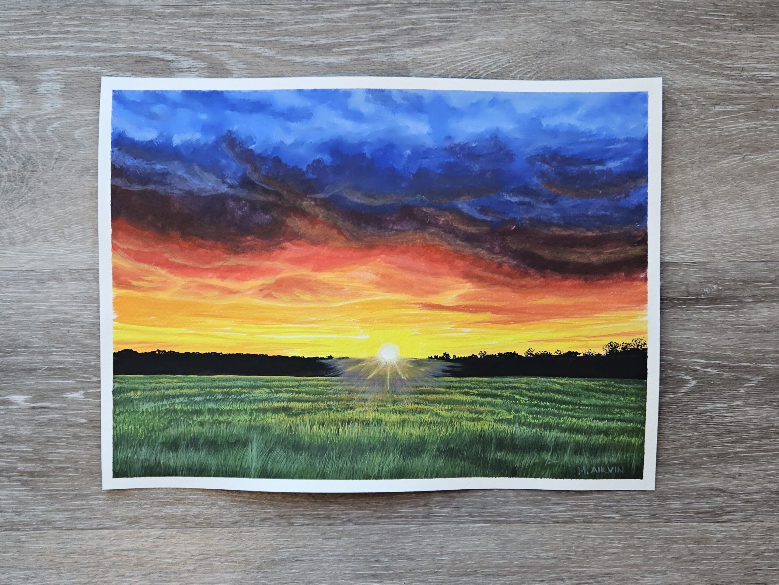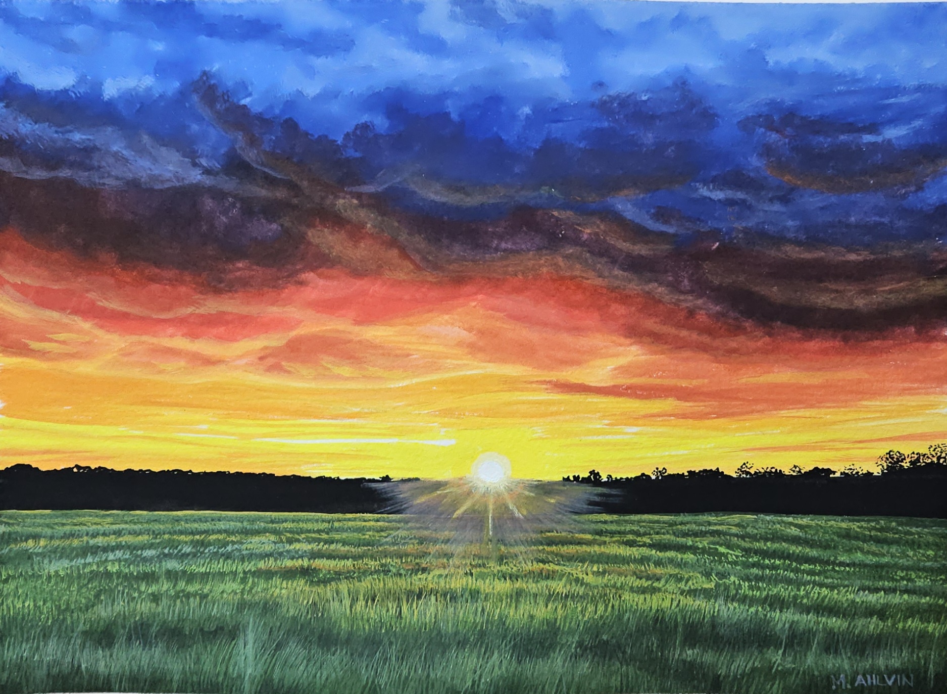 Although we’re blessed with an abundance of beautiful sunsets in Alaska, my travels to Texas over the last few years has introduced me to a different kind of evening spectacle: the Texas sunset. I have found myself fascinated by these sunsets and the first time I saw one I knew that I wanted to paint one. Although similar in some ways to our Alaska sunsets, they offer a quiet contrast to the dramatic mountain backdrops that often are illuminated by the setting sun in Alaska.