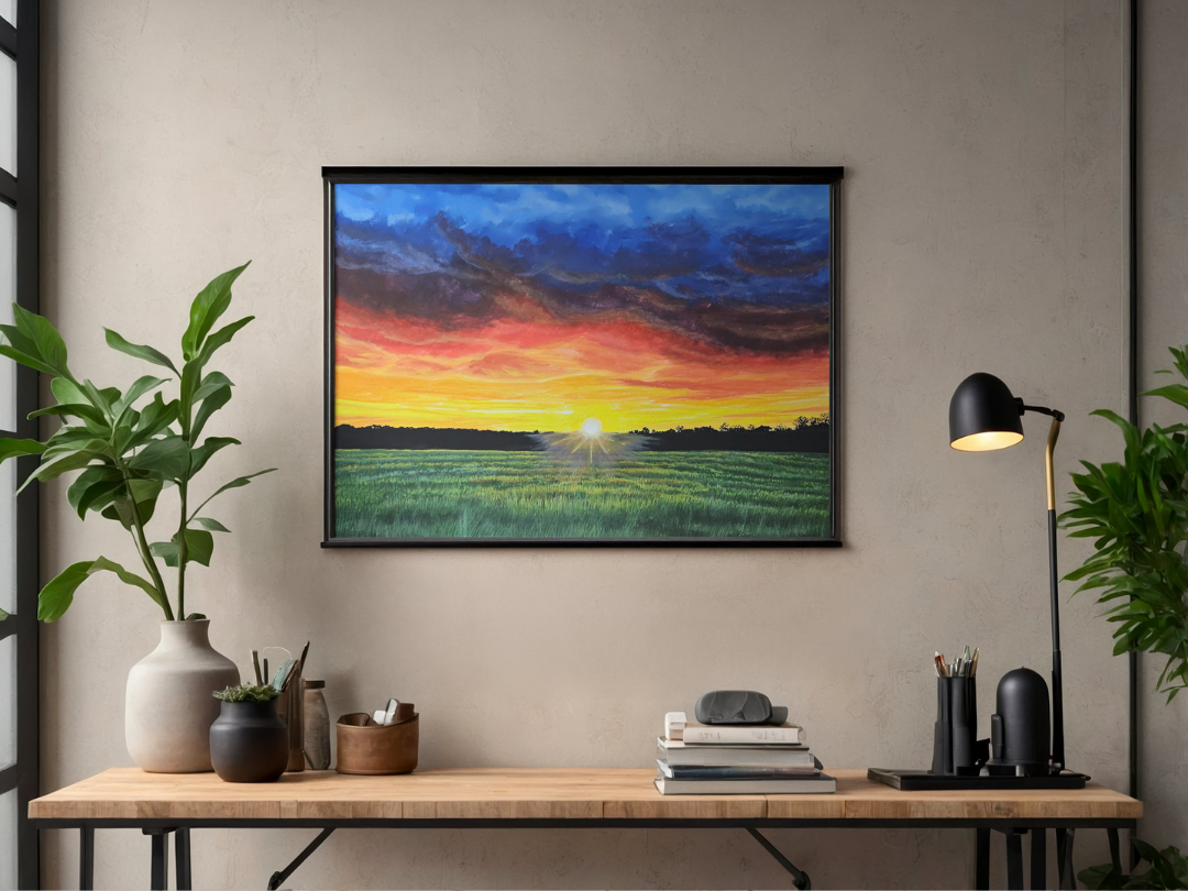 Instead of towering peaks, the sunset depicted in Texas Twilight is defined by wide open fields and distant tree lines stretching across the horizon. The land itself feels expansive and unassuming, allowing the setting sun to take center stage. As the sun sets, the horizon often burns with intense brightness, while scattered clouds catch layers of yellow, orange, and red before gradually giving way to deeper blues above. There’s a calm satisfaction in watching this slow transition—a sense of stillness as the day gently comes to an end.